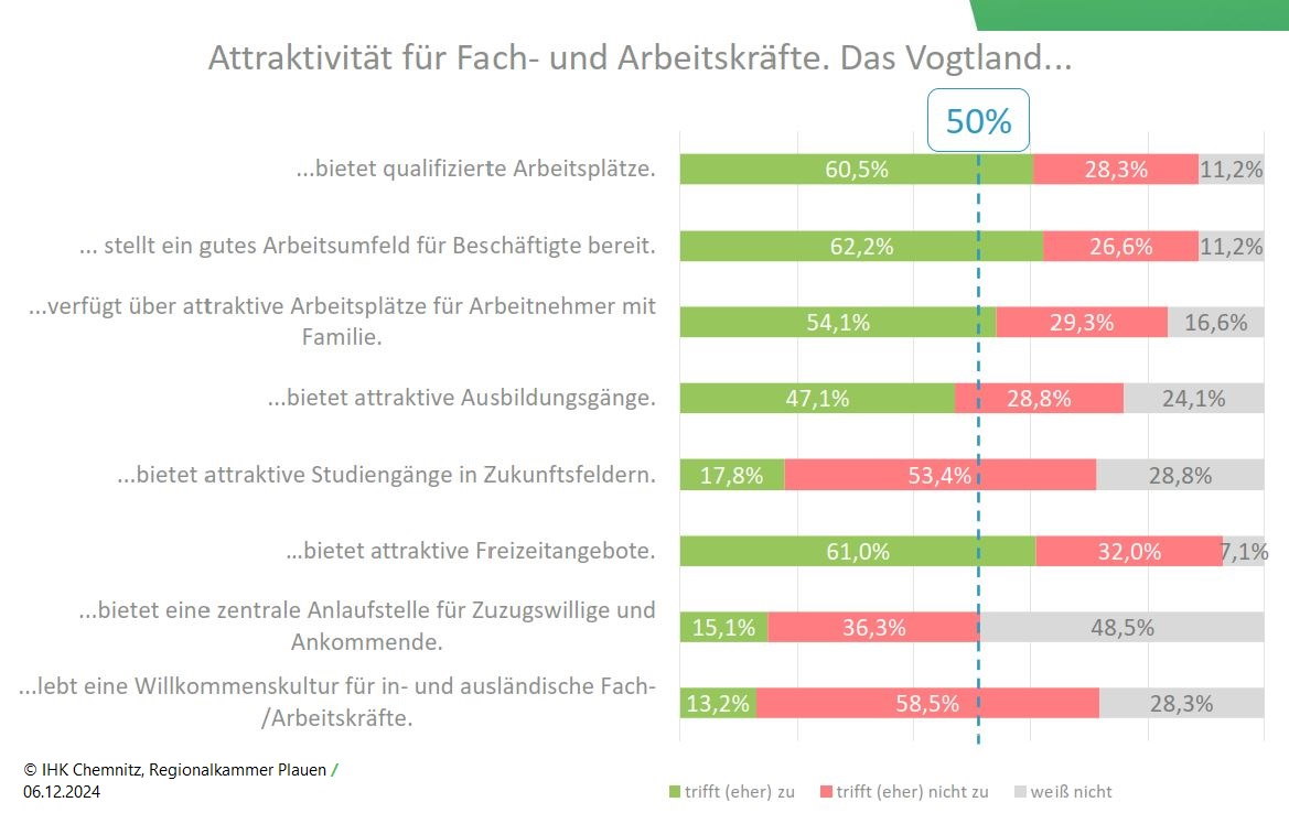 Für die aktuelle Analyse des Standortes wurde ein Meinungsbild durch die Unternehmerschaft im Vogtland erstellt. So wurden im August des aktuellen Jahres 2024 rund 5000 vogtländische Unternehmen aus allen Branchen zu notwendigen Faktoren und Indikatoren zur Einschätzung des Standortes befragt. Hierzu konnten Stärken, Schwächen und Prognosen für das Vogtland ermittelt werden. Es beteiligten sich rund 10 % der befragten Unternehmen und beurteilten Schlüsselfaktoren wie Wirtschaftsraum, Tourismus, Netzwerk, Lebensumstände, Menschen und viele weitere Eckpunkte für die richtige Einschätzung.
